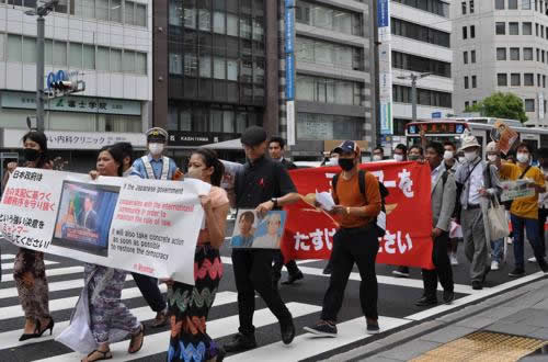 5月19日午後、G7サミットが開かれた広島に全国から80人の在日ミャンマー人が集まり、「日本政府はミャンマー独裁軍政を認めるな」と抗議するデモを行いました(写真)。ちょうど8・6ヒロシマ大行動が本通を行進していた時、ミャンマーのデモは電車通りを紙屋町交差点に向かっていました。21日にも在日ミャンマー人は広島、東京で抗議デモをしました。