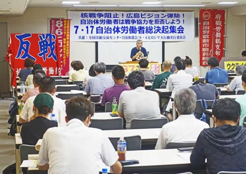 7月17日、広島市内で、全国労組交流センター自治体労働者部会と8・6ヒロシマ大行動実行委員会共催の自治体労働者総決起集会に80人が結集。G7広島サミット粉砕の先陣を切った4・30自治体集会をさらにグレードアップさせ、8・6総決起へ自信と確信に満ちた集会となりました。