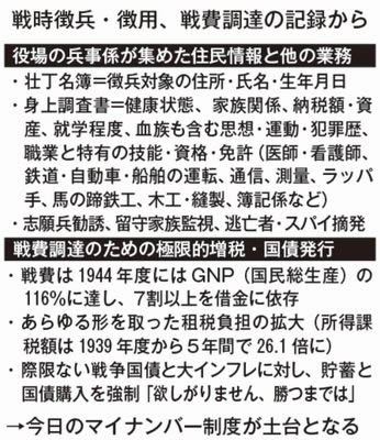 その重大性は、①かつて戦時下の徴兵・徴用(戦争動員)を担った全国の市町村役場の兵事係が(敗戦後の軍の焼却処分命令に逆らって)残した資料と証言、②日帝の戦争財政の歴史から知ることができる。今日のマイナンバーに基づく住民情報の国家掌握が、戦時体制の土台として準備されていることが明確になる。