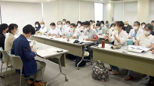 厚生労働省は先日、全国でのマイナ保険証利用率が7月時点で5%にまで下落したことを発表した。岸田政権下で大軍拡と同時に強行されたマイナ保険証取得の実質義務化に対し、多くの労働者人民が戦時体制づくりという本質をつかんで拒否を貫いている。医療現場の労働者が反対の闘いを巻き起こせば、絶対に廃止に追い込める! この確信も固く、多忙な医療・介護現場から40人以上が集まった。とりわけ、2019年に「地域医療交流会」を結成し地域で運動を広げてきた大阪府八尾市の八尾北医療センター労組、高槻市の高槻医療福祉労組から執行部を先頭に多くの組合員が駆けつけた。