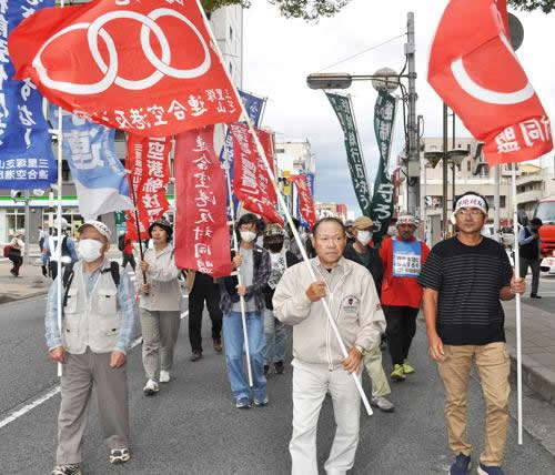 (写真 耕作権裁判勝利へ! 市東孝雄さん【中央】ら三里塚反対同盟を先頭に千葉地裁に向かってデモ【9月25日 千葉市】)