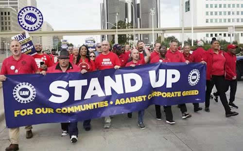 今回、40%以上の賃上げ、インフレ率にあわせて賃金を上げる生計費調整の復活、労働者を分断支配する階層制の廃止、医療・年金制度の復活、EV(電気自動車)移行後の雇用確保などが現場労働者の要求として掲げられた。UAW本部はこれらを表向きは受け入れたが、全工場一斉ストという組合員の要求は拒否。ストを3工場(1万3千人)に限定し、9割の労働者に出勤を指令した。資本が譲歩を拒む中で22日にストを拡大したが、これも部品配送センターに限定した。