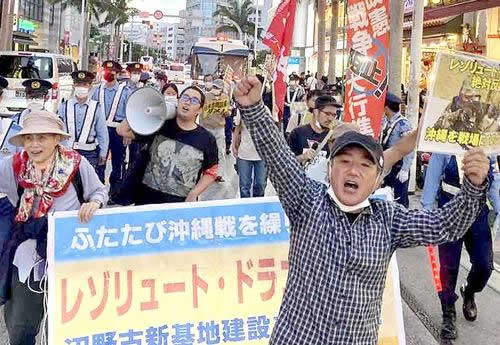 沖縄では、那覇市県庁前広場で街頭宣伝とスタンディングが行われ、初参加の人もアピール。その後、国際通りでデモが行われた。
