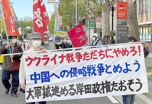 大阪では、豊崎西公園での反戦集会と梅田の繁華街を行進するデモがかちとられた。梅田反戦デモは毎月取り組まれてきたが今回の注目度は段違いで、多くの10代の若者が合流。200人の参加者は半数が飛び入りで合流してきた市民だった。