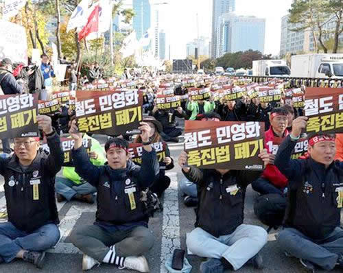 (写真 「鉄道民営化促進法廃棄!」。鉄道労働者の総力決意大会【11月7日 ソウル】)