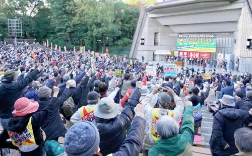 全国労働者総決起集会/改憲・戦争阻止!1万人大行進が11月19日、東京・日比谷野外音楽堂で開かれ、2800人が結集した。動労千葉、全日建運輸連帯労組関西地区生コン支部、全国金属機械労組港合同が呼びかける11月集会は26回を迎えた。ウクライナ戦争が続き、イスラエルによるパレスチナ人民大虐殺が強行され、日米帝国主義の中国侵略戦争が迫る中、民主労総ソウル地域本部やアメリカの国際港湾倉庫労組(ILWU)第10支部(ローカル10)、ドイツの鉄道労働者ネットワークなどを迎えた集会は、国際連帯で戦争を阻止する大闘争になった。戦時下で反戦を貫く階級的労働運動の構築へ熱い決意がみなぎった。集会は韓日労働者共同声明2023を確認し、パレスチナ連帯決議を採択、各国で戦争阻止の闘いに立つと誓った。集会後、銀座を通り東京駅に向かうデモには途中から200人以上が合流し、「ガザ大虐殺をやめろ」「岸田打倒」の怒りの叫びをとどろかせ、沿道の熱い共感に迎えられた。(主な集会発言2〜3面、関連記事4面)