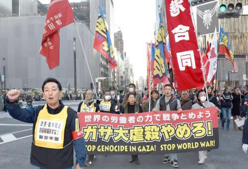 港合同の木下浩平執行委員が開会あいさつでガザ大虐殺を弾劾し「戦争を止める力はわれわれにある」と強調した。また、港合同昌一金属支部は翌20日にストライキに立つと宣言した。