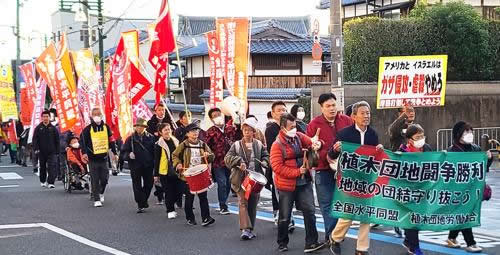 一貫して植木団地労働組合と連帯してきた関西生コン支部大阪Bブロック、高槻医療福祉労働組合の冨山玲子委員長や植木団地組合員などが決意を語り、最後に全国水平同盟の久原正子委員長のまとめと「団結がんばろう」の後、富寿栄団地を通り阪急富田駅近くまで荊冠(けいかん)旗や組合旗をはためかせてデモ行進しました。
