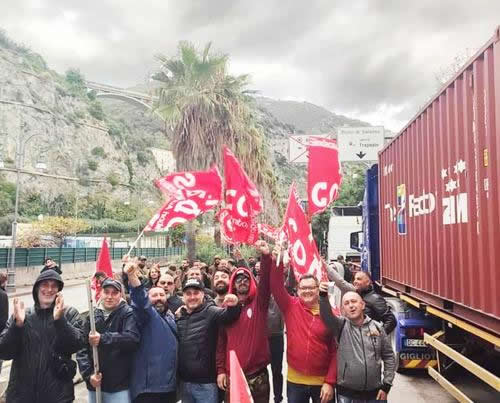 (写真 昨年11月17日、S.I.Cobasが港湾封鎖でイスラエル・ZIMのコンテナを止めた【イタリア・サレルノ市】)