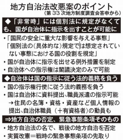 改悪案は首相の諮問機関・第33次地方制度調査会(地制調)が12月に出した答申に沿ったものだ。これに、自治体側は「指示が乱発されれば地方の自主性を損なう」と懸念を表明。12月7日付北海道新聞は社説で「国の指示権拡大/分権に逆行する改悪だ」と反対し「緊急時の国の権限強化は憲法に緊急事態条項を新設する自民党中心の改憲の動きとも通底する。国家権力の乱用を抑え、自治を守る覚悟」を訴えた。日弁連は1月18日、答申反対の意見書を政府に提出した。