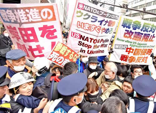機動隊バスを13台以上配置し広範囲の交通規制を敷いた警察権力の弾圧をものともせずデモ隊が進む。「ウクライナ戦争ただちにやめろ!」「復興会議は戦争会議!」「日本の参戦許さないぞ!」「戦争推進の岸田を許すな!」「経団連を許すな!」。本郷通りに入ると右前方に経団連会館のビルが迫ってくる。怒りを倍加し声を張り上げた。