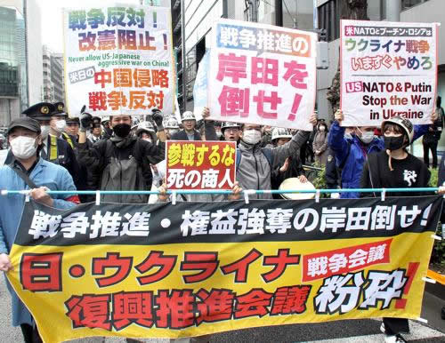 日ウ復興会議は都内の経団連会館において政府・経団連などの主催で開かれ、ウクライナ首相も出席。午前9時、岸田らが出席する10時に狙いを定め、「『復興』に名を借りた日本のウクライナ戦争参戦を許さない」と怒りに燃えた全学連と労働者ら80人が神田淡路町の淡路公園に結集した。全学連の矢嶋尋副委員長がデモの意義を提起し、大行進東京の医療労働者が「経団連は労働者を4割非正規化し過労死させてきた連中だ。こんな復興会議は支配階級を支え、戦争を泥沼化させロシア・ウクライナの人民を犠牲にするものだ」と弾劾。全学連の亀井陽慧書記次長が「ラファでは大虐殺が始まっている。ウクライナ戦争はウクライナを前面に立たせた帝国主義の対ロシア戦争であり、米帝の中国侵略戦争の一環だ。岸田はG7広島サミットでウクライナの『反転攻勢』にゴーサインを出した。いったい何万人の命が奪われたことか! あそこに集まる資本家・政治家は生き血を吸って戦争でもうけているやつらだ。粉砕しかない!」と訴えた。大行進呼びかけ人の高山俊吉弁護士が「多くの政治勢力が何も言わないその時に、我々は絶対にこれに反対する」と檄(げき)を飛ばし、参加者は大手町の経団連会館に向けたデモに出発した。