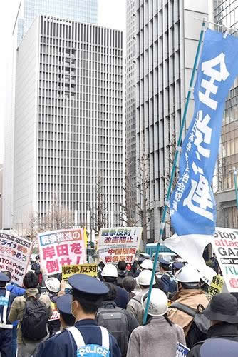 デモ終了後、経団連会館に向かって移動。会館から200㍍付近の歩道で警察が阻止線を張り、行く手を阻む。わが部隊は警察と激突。スクラムを組み一歩も引かず押し込む。全学連が次々とマイクを握り抗議の嵐を岸田と経団連にたたきつけ、婦人民主クラブ全国協や青年労働者も続く。公安警察は顔をひきつらせ右往左往し、指揮官車から「全学連はすぐ解散しなさい。周りを見なさい。迷惑している」とがなり立てる。だがすかさず「世界戦争への国際的怒りの爆発を見ていないのは、お前たちだ」「お前たちが守っているのは、ウクライナで、ガザで人民虐殺に加担する支配者の利益だ。腐った岸田の先兵は恥を知れ!」と弾劾し権力を圧倒。1時間に及ぶ実力闘争は復興会議の正体を暴き2・24新宿デモへの突破口を切り開いた。