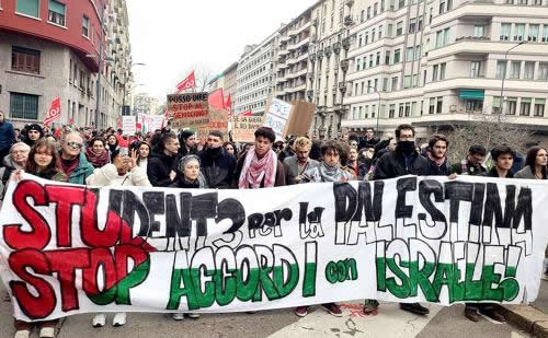 (写真 「ジェノサイドをやめろ!」。大学当局に対してイスラエルとの協力関係を絶つよう求めて闘ってきた学生たちもデモに大合流した【2月24日 ミラノ】)