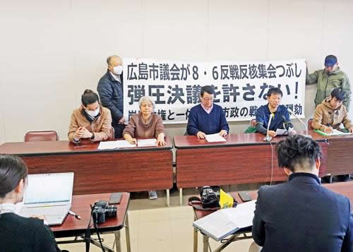 2月27日、広島市議会は、8月6日の原爆ドーム周辺での反戦反核運動への規制・弾圧を市に要求する2本の決議を本会議で採択した。8・6ヒロシマ大行動の集会・デモを始めとした一切の行動を禁圧しようとする暴挙に対して、8・6ヒロシマ大行動実行委員会は朝から市庁舎前と市議会前でのビラまき・マイク宣伝を行い、通勤・通学の労働者・学生、特に市職員に「広島市議会による弾圧決議を許すな」と訴えた。サミット闘争以来「広島で筋を通しているのはあなたたちだけだ」と応援の声をかけて下さる人も駆けつけた。冷たい風が強く吹く中、市議会を怒りの声で包囲した。市議会の傍聴席には、松井一實市長による職員研修での教育勅語利用に反対する人々を中心に、広島市政に怒りや疑問をもつ多くの市民が駆けつけた。