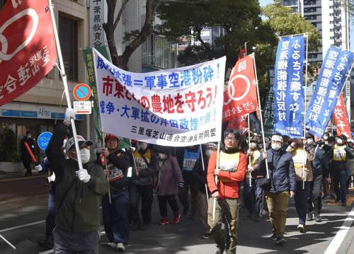 (写真 三里塚耕作権裁判開廷を前に「農地死守、戦争反対」を訴えて千葉市内をデモする三里塚反対同盟と支援【3月18日 千葉市】)