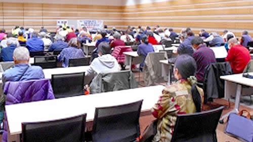 午後からは近くのコンベンションセンターで集会を行いました。日教組奈良市の有田雅行委員長の力強いあいさつの中で、この日全日ストライキに決起して駆けつけた関西合同労組恭誠社分会が紹介され、100人近い参加者が圧倒的な拍手を送り、1時間半の熱気あふれる集会が始まりました。