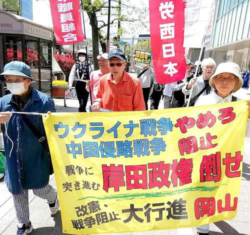 4月14日、改憲・戦争阻止!大行進岡山の呼びかけで、中国侵略戦争阻止・岸田打倒を掲げて20人で岡山市内デモを闘った。