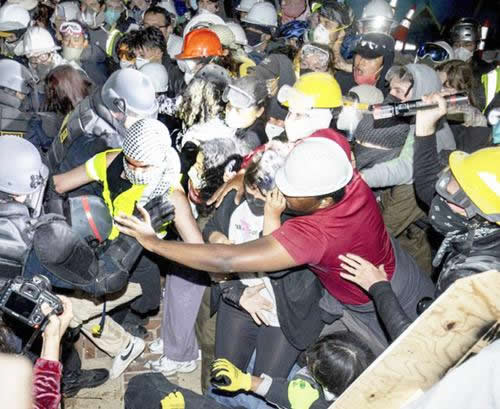 カリフォルニア大学ロサンゼルス校では4月30日夜、シオニスト組織が棍棒(こんぼう)、化学薬品、催涙ガス、花火などを武器としてガザ連帯キャンプに襲撃をかけた。駆けつけた警察は静観した後に学生に暴行を加えて逮捕した。だが、学生たちはあらかじめバリケードを築き、ヘルメットで武装した最先頭の守備隊がシオニストの襲撃から数時間もキャンプを守り切ったのだ。この戦闘的団結により、警察によるキャンプの撤去後も集会とデモを次々に拡大している。
