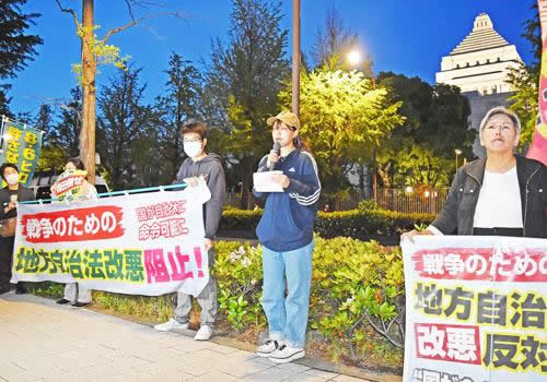 反動諸法案の成立が恐るべき勢いで進む戦争翼賛国会で、地方自治法改悪案の審議が本格化しています。その核心は国が「国民の安全に重大な影響を与える事態が発生する恐れがある」と判断すれば、自治体に無制限に指示=命令できるようになるということです。全土の軍事利用と自治体労働者の戦争動員、住民情報―徴兵・徴用名簿の提出強制への道を開くものです。
