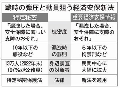 経済安保新法は、2014年に施行された特定秘密保護法(スパイ防止法)が秘密保護の対象を「防衛、外交」などに限定しているものを経済分野に拡大する。「漏洩(ろうえい)すると安全保障に支障が生じる」情報を政府が「重要経済安保情報」に指定し、あらかじめ「適性評価制度(セキュリティークリアランス)」をクリアした者にだけ情報を扱う権限を与える。情報を他人に漏らした者、また「違法に」取得した者には、5年以下の拘禁刑や500万円以下の罰金が課される。機密性がより高い情報の漏洩には特定秘密保護法(懲役10年以下の罰則)を適用する。「共謀・教唆・扇動」も処罰される。ジャーナリストや市民が、軍事研究と密接に関わる産業技術の秘密情報を入手し、反戦の立場からそれを暴露・報道することも処罰しようとしている。