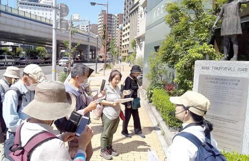 (写真 神戸港付近の碑巡りをする大行進兵庫の仲間たち)