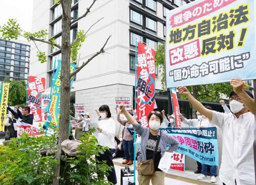 地方自治法改悪を許すな 週刊『前進』04頁(3346号04面02)(2024/05/27) 地方自治法改悪を許すな 戦争のために政府が自治体に無制限に指示=命令を出せるようにする地方自治法改悪案の衆院総務委員会採決を許さず、労組交流センター自治体部会と改憲・戦争阻止!大行進が緊急の国会闘争に立った(5月23日 東京都千代田区) Tweet 前の記事 次の記事