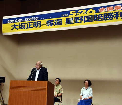 星野全国再審連絡会議共同代表の狩野満男さんが主催者あいさつに立ち、被告・国を追いつめている星野国賠勝利とともに、「今最大の課題は大坂さんの奪還だ」と断言し、控訴審絶対勝利へ、広島での4・27救援会結成に続き、大衆的な大救援運動をつくろうと呼びかけた。