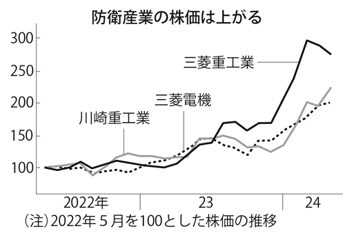 三菱重工の軍事関連事業の受注は前年度比3・4倍の1兆4781億円となり、総受注髙は前年度比48・5%増の6兆6840億円へと上昇、軍需だけで総受注髙の2割を超えた。三菱電機は鎌倉製作所(神奈川県)など3カ所で軍需品の生産工場の新設を発表、2期連続で過去最高の連結純利益を見込む。川崎重工業も25年3月期には過去最高の連結純利益を予想している。IHIは31年3月期の軍事事業の売上収益を、23年3月期の2・5倍の2500億円規模まで伸ばす計画だ。三菱重工とIHIは英伊と共同で行う次期戦闘機の開発にも参画する。