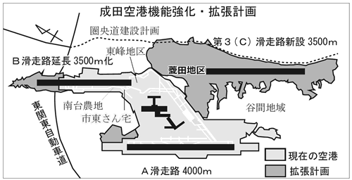 成田空港会社(NAA)は4月、「機能強化・滑走路整備計画の概要について」の改訂版パンフを公表し、空港拡張に向けた国家意思をむき出しにした。B滑走路を北に延伸して3500㍍化し、さらに第3滑走路(C滑走路、3500㍍)を新設する計画だ。すでに東関東自動車道トンネル化工事、B滑走路北延伸の造成工事、C滑走路新設のための高谷川付け替え工事などに着手している。
