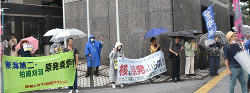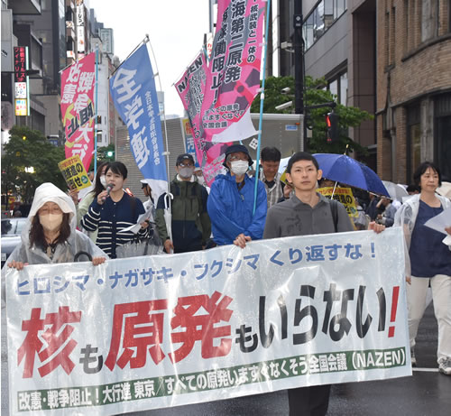 6月21日、改憲・戦争阻止!大行進東京、すべての原発いますぐなくそう全国会議(NAZEN)、東京労組交流センターが東京電力ホールディングスに対し、柏崎刈羽原発の再稼働や使用済み核燃料の青森むつ中間貯蔵施設への搬出、放射能汚染水の海洋放出を中止することなどを求める署名提出・申し入れとデモを行った