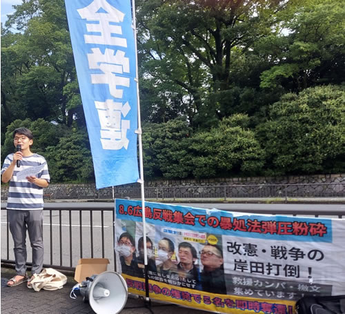 髙田君再逮捕の「容疑」は事実無根であり、100%でっち上げです。熊野寮への家宅捜索では、機動隊バス10台を配置して暴力的に制圧し、闘う京大生の戦争反対の闘いをたたきつぶそうとしてきました。また、国家権力はマスコミを動員して、「8月6日に広島で市職員に暴行した人物」と悪質なキャンペーンを行い、日帝・岸田政権の中国侵略戦争と闘う髙田君らの正義性を貶(おとし)めようとしてきました。しかしそれは、暴処法による5人の逮捕と平和公園封鎖までして、核と戦争に対する労働者階級人民の怒りを封じ込めようとしてきた攻撃が大破産していることを示しています。青年たちが体を張って戦争反対を闘った事実は、どんな弾圧によっても消し去ることはできません。広島の被爆者・労働者市民がそのことを一番よく知っています。