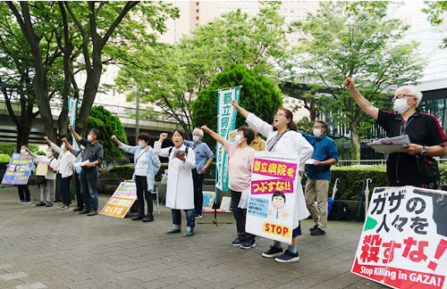 さらに、地方自治法改悪で政府の権限が強められる中、機構定款の「災害及び公衆衛生上の緊急事態等に対処するために必要な業務を行う」との規定は都立病院と労働者の戦争動員に直結すると指摘。職員は「都の要請に基づき対応する」「知事の要求に従う」と繰り返し、「緊急事態等」の内容については明言を避けたが、狙いが医療の戦争動員にあることは明らかだ。