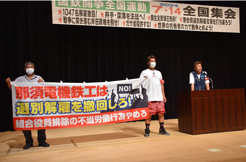 7月11日に大阪地裁で仮処分の審尋が開かれました。裁判官は組合を嫌悪し結論ありきという態度を隠そうとしません。那須電機鉄工がスポンサーから降りると破産になり労働者が雇用を失う緊急事態だから提示した解決金に応じろと言うが、従うことはできません。大阪府労働委員会で、那須電機鉄工、那須電機商事が事業を継承する会社は労組法上の使用者に該当しないと主張している根拠は国鉄分割・民営化です。しかし1047名解雇撤回闘争は、不採用基準は不当労働行為だと認めさせました。私たちは国鉄闘争の前進に依拠して闘いぬきたいと思います。