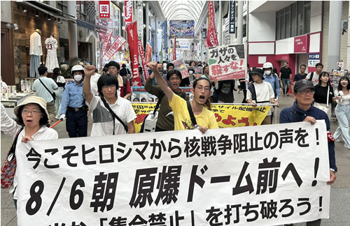 被爆2世の壹貫田康博さんは「8・6は前夜午後10時から座り込もう」と戦闘宣言を発しました。発言の最後は、去年から闘いに決起した広大自治会の若い学生が「体を張って、人生をかけて反戦反核を闘う」と決意表明し、参加者を勇気づけました。