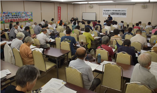 冒頭、実行委を代表して「改憲・戦争阻止!教え子を再び戦場に送らない!広島教職員100人声明」から、「今、ヒロシマはとても大変だけれど、今ある力を全部出して今日と明日、共にがんばっていきましょう」と呼びかけられました。次に、実行委の日教組奈良市の増田順計書記長から、「『8・6ドーム前に全力で結集し、中国侵略戦争のための反戦反核集会禁圧を許すな!』が今日一番訴えたいこと。ヒロシマ大行動史上、最大の団結と結集で闘おう」と、鮮明な基調報告がありました。