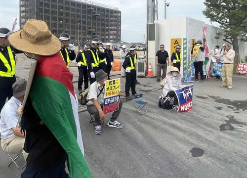 この不当極まる土地強奪と軍事基地建設を阻止するため、私たちは四つある車両搬入ゲートの前で、警備員・警察と対峙(たいじ)しながら土砂を積んだダンプなどに立ちはだかりました。妨害に来た右翼は仲間の一喝で粉砕され、即座に退散。意気軒高と終日の座り込みを闘い抜きました。