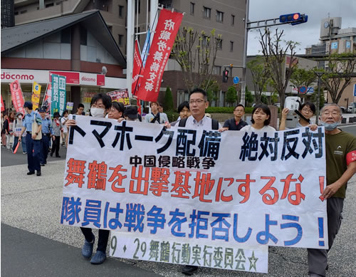 舞鶴市の東舞鶴駅南公園で9月29日、実行委員会主催の舞鶴行動を100人の結集で打ちぬいた。舞鶴、祝園(ほうその)、神戸港、八尾空港、関西新空港、大阪港を中国侵略戦争の拠点にする攻撃のもとで、反戦反基地闘争を闘う改憲・戦争阻止!大行進に結集する労働組合や学生、闘う組織が全関西から駆けつけ、一堂に会する画期的な集会となった。