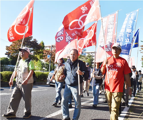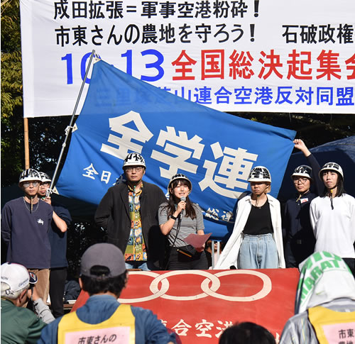 三里塚芝山連合空港反対同盟が主催する全国集会が10月13日、成田市赤坂公園において開かれ、全国から480人が結集した。参加者全員が、天神峰・市東孝雄さんの南台農地を実力で守り抜く決意を固め、成田空港の軍事化、中国侵略戦争への出撃拠点化を粉砕する気概で、成田ニュータウンをデモ行進した。