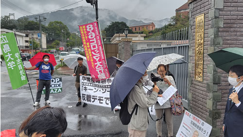 8・6ヒロシマ大行動は22日、海上自衛隊呉地方総監部にキーン・ソード25の中止を申し入れた。呉在住の労働者・市民を先頭に10人以上が結集し、「中国侵略戦争反対」「自衛隊員は侵略の銃を取るな」と訴えた。