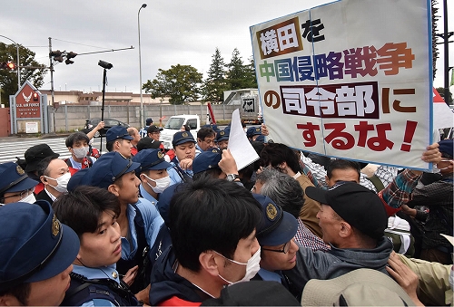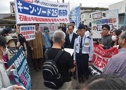 デモ終了後、参加者は第2ゲート前に移動し、航空自衛隊司令宛ての申入書を手渡した。続いて参加者は、在日米軍司令官に申し入れるために道路の反対側のゲートに向かおうとした。だが許しがたいことに機動隊員らは何の法的根拠もなく阻止線を張った。米軍はあわてて正門を鉄のバリケードで閉じた。学生を先頭に実力で渡ろうとすると、機動隊は車道にはみ出しながら二重三重の「壁」をつくって押し返し、それでもこちらが引かず一進一退の攻防になると、最後は機動隊車両2両で道を封鎖。「警察は何を守っているのか!」「これこそ中国侵略戦争に突き進む日本帝国主義の姿だ!」----。参加者は怒りを倍増させ、徹底弾劾をたたきつけた。