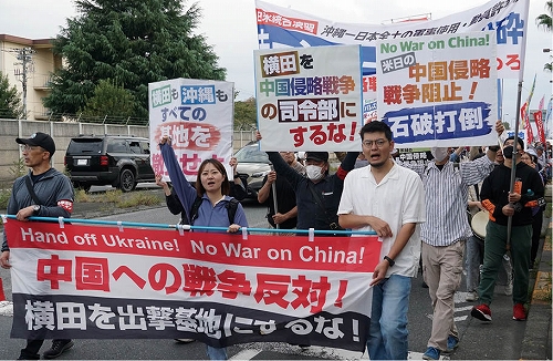 大行進東京の洞口朋子杉並区議は、11・3を訴える街頭宣伝での手応えを語った。最後に全学連の仲間が、10・7闘争でつかんだ確信も固く、横田を中国侵略戦争の出撃基地にすることを絶対に許さないと怒りのアピール。全体の熱気が高まる中で勢いよくデモに出発した。横田基地沿いに進むデモは注目を集め、ビラも次々と受け取られた。