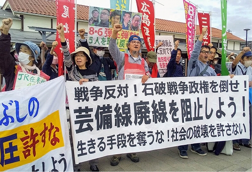 すでに廃線化された可部線の地元の広島県安芸太田町の大江厚子町議は、地方切り捨てが進む一方、米軍岩国基地で軍用機訓練が激化している現実を暴いた。自治労広島市の住廣美智子さんが、8・6広島暴処法弾圧の5人と団結して闘う決意を表した。広島大学自治会は、呉や岩国の自衛隊・米軍基地へのキーン・ソード25演習反対の抗議・申し入れ闘争を呼びかけた。さらに東京から駆け付けた東交の労働者、庄原市の教育労働者が廃線反対の発言を行い、岡崎昭夫副委員長が集会をまとめた。