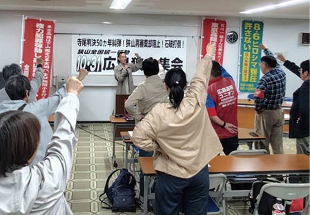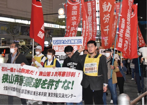 石川一雄さんの「私の闘魂は衰えることはありません。『三次の次はない』との決意で闘う」とのメッセージが紹介され、これを受けて西郡、高槻、崇仁・東三条の各支部が決意を表明した。切迫する狭山再審棄却情勢への怒りを新たに、11・3大結集で石川さんの再審勝利を切り開く決意を打ち固め、石川さんと連帯する戦闘的なデモに打って出た。