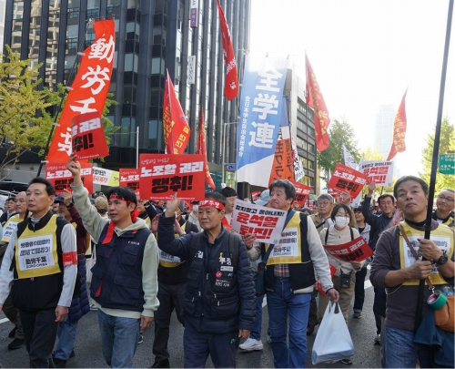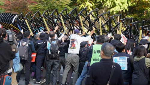 11月9日の全国労働者大会は、機動隊の規制線を実力で押し返し、南大門につながる世宗大路の全9車線を実力で解放してかちとられた。不当な規制に対し、組合員たちは「暴力警察は出ていけ! ユンソンニョルは出ていけ!」と叫び、スクラムを組んで機動隊と激突。11人が連行され、100人以上が負傷しながらもバリケードを押し返して空間を切り開いた。警察はその後恥知らずにも病院に押し入り重傷の組合員を連行した。連日、警察署前などで抗議行動が闘われた。
