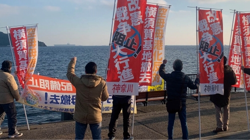 米原子力空母ジョージ・ワシントン(GW)が11月22日、米海軍横須賀基地に入港した。GWは、米本国で最新鋭ステルス戦闘機F35CやCMV22オスプレイの搭載を可能とする大規模改修を行い、入港直前まで日米韓大規模演習「フリーダム・エッジ」に参加していた。改憲・戦争阻止!大行進神奈川は、神奈川平和運動センターが呼びかける岸壁での抗議行動に合流。浦賀水道から船影が見え始めると、中国侵略戦争のための横須賀基地配備に対し声の限り抗議をたたきつけた(横須賀市)