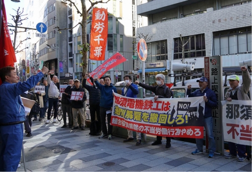 全国金属機械労組港合同昌一金属支部は11月28日、東京の那須電機鉄工本社と同社の大株主の三井住友銀行本店に対する抗議・申し入れ行動を展開した。
