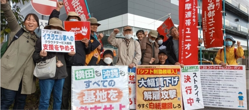 11・29ストライキは、労組つぶしとイスラエル軍事支援で悪名高いアマゾン資本に対する世界各地のストライキ、抗議行動、街頭デモなどの国際連帯闘争の先陣を切る闘いであった。また沖縄コールセンター労組の11・29ストと連帯し、米日の中国侵略戦争阻止、辺野古新基地建設阻止、安保粉砕・全基地撤去、横田基地撤去を全労働者に呼びかける反戦ストとして闘いぬかれた。現場には多摩連帯ユニオン、三多摩労組交流センター、東京西部ユニオンの仲間が駆けつけ、沖縄コールセンター労組をはじめ全国の労組から連帯メッセージが寄せられた。