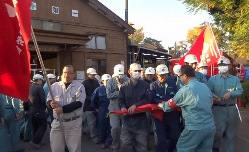 (写真 2年連続の秋闘ストライキを会社にたたきつけ、組合旗を先頭に構内デモを敢行【11月22日 東京都八王子市】)