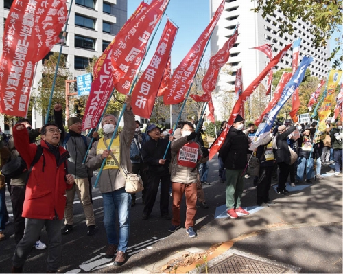 正午前、日比谷公園に結集し、全国水平同盟の久原正子委員長、部落解放東日本共闘会議の徳永健生事務局長、全学連の発言を受けてデモに出発。「狭山差別裁判糾弾!」「石川一雄さんは無実だ」のコールを霞が関一帯に響かせ、下山鑑定の事実調べを行わない東京高裁・家令和典裁判長へ怒りをたたきつけました。